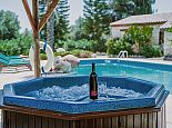 Private pool (10 x 4 meters - max depth 1.40 - min depth 1.20) with sun loungers, exterior Jacuzzi (cold), built-in barbecue (charcoal) and comfortable patio/dining furniture.